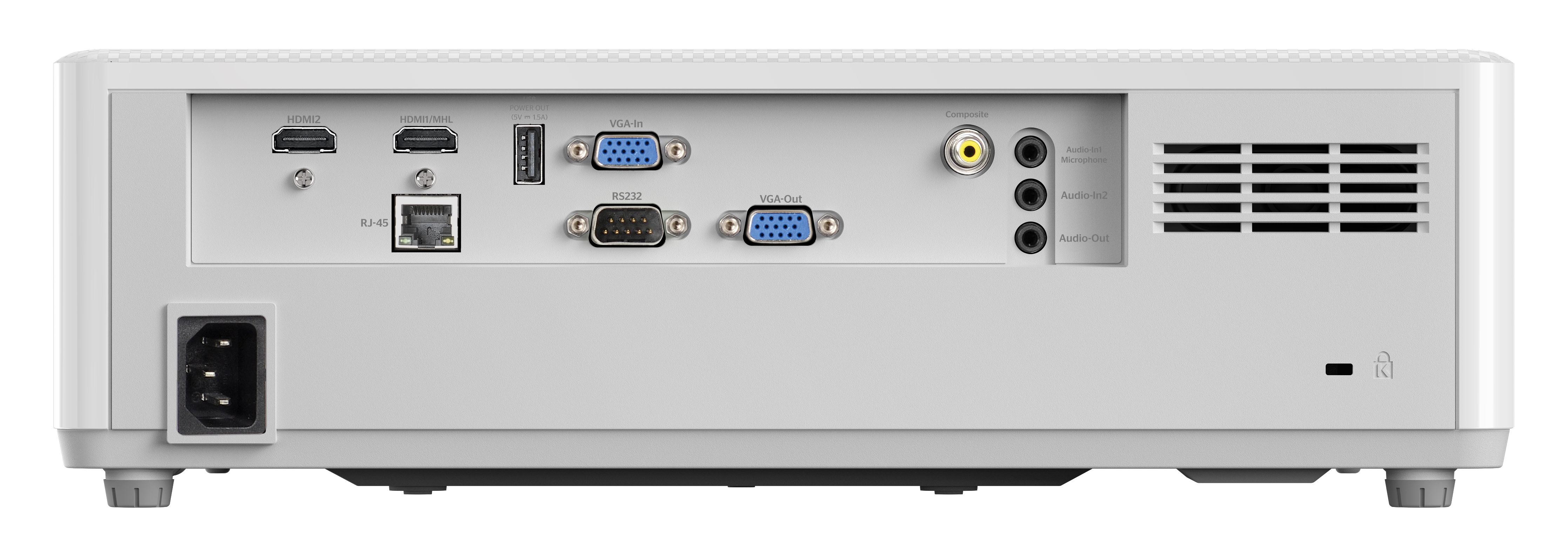 DLP,FullHD(1920*1080),5000 ANSI lm;300000:1; IP5X; TR 1.4-2.24:1; Lens Shift V 99%;HDMIx2+MHL; VGA x1;Composite Video; Mic3,5 x1; AudioIN x1; VGA Out x1; AudioOUT x1; USB-A power 1.5A;RS232;RJ45; 10Wx2; 28dB; 5.5kg.